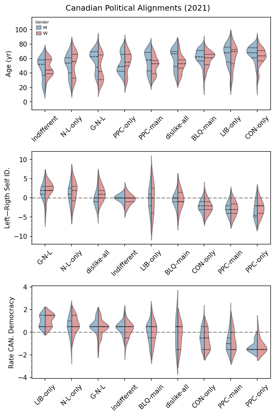 Younger, left-leaning demographics with higher satisfaction in Canada’s democracy are more likely to view multiple parties favorably, suggesting vote fluidity and lower partisanship.